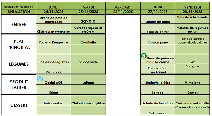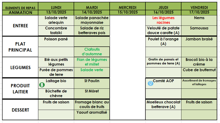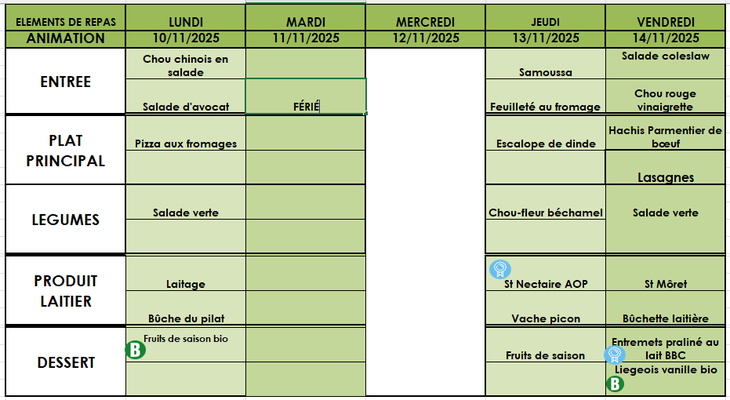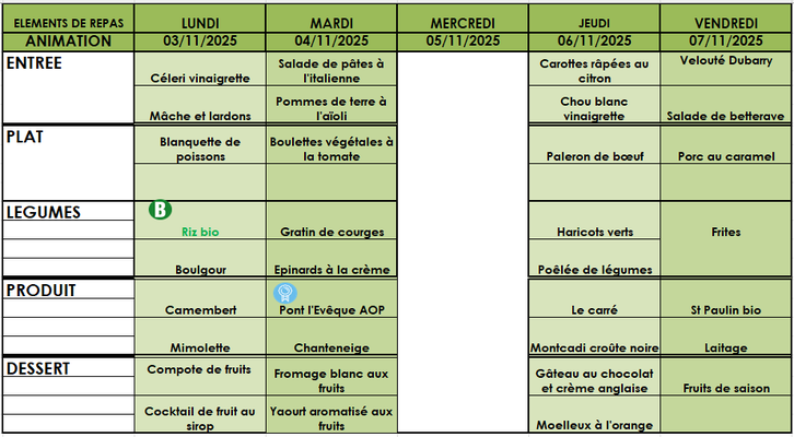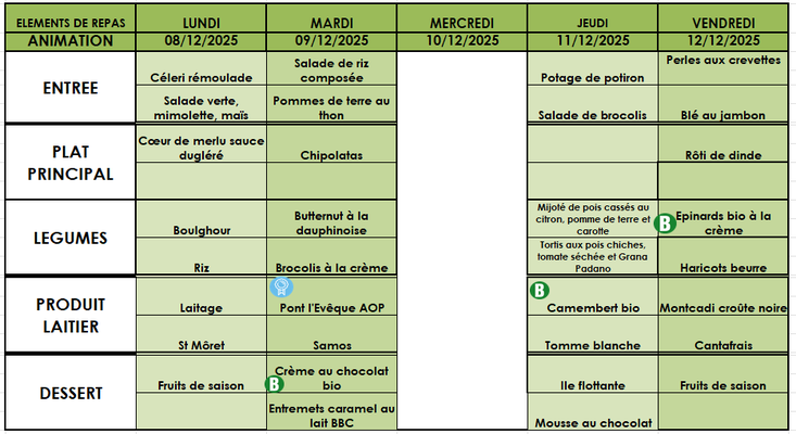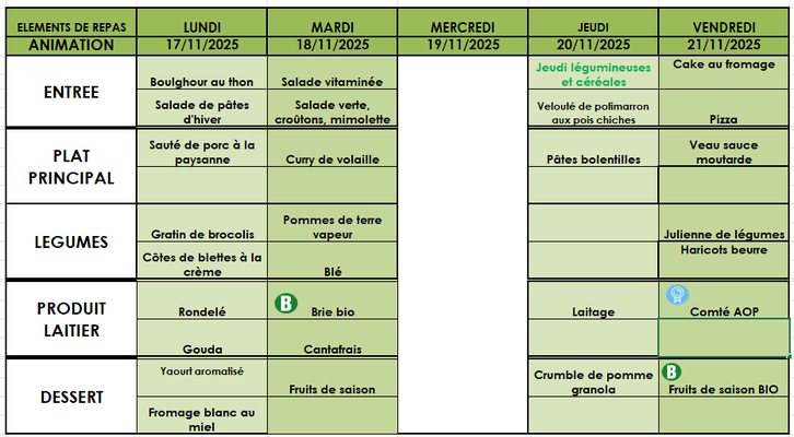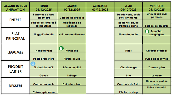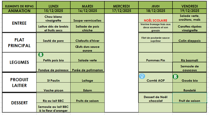 Aussi, vous trouverez les menus jusqu'aux vacances de noël.
